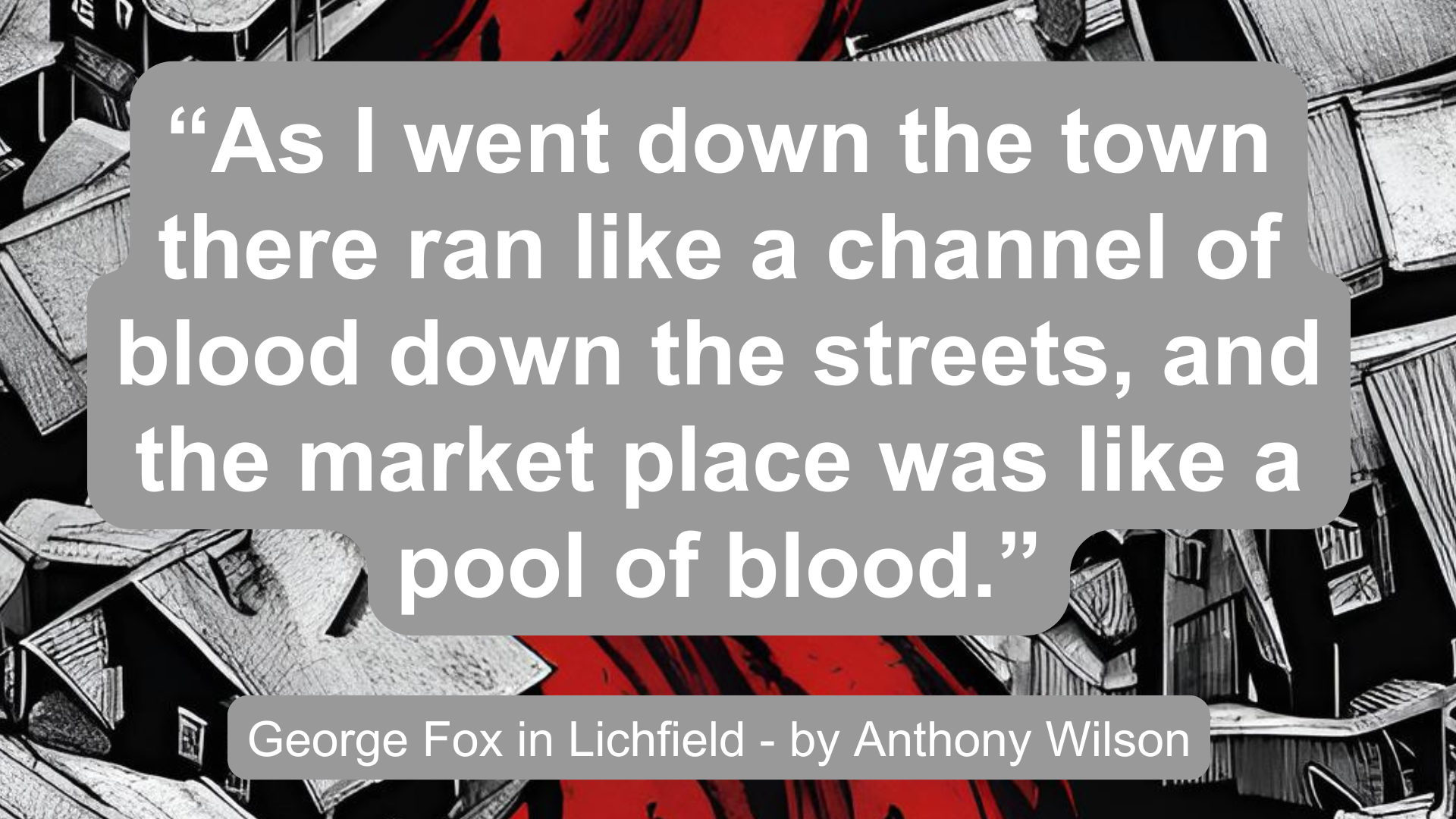 “So I went about a mile till I came to the town, and as soon as I came within the town the word of the Lord came to me again to cry ‘Woe unto the bloody city of Lichfield!’; so I went up and down the streets crying ‘Woe to the bloody city of Lichfield!’. Being market day I went in to the market place and went up and down in several places of it and made stands, crying ‘Woe unto the bloody city of Lichfield!’, and no-one touched me or laid hands on me. As I went down the town there ran like a channel of blood down the streets, and the market place was like a pool of blood.