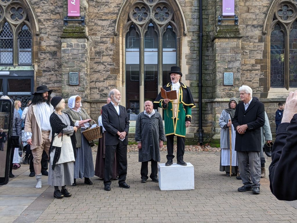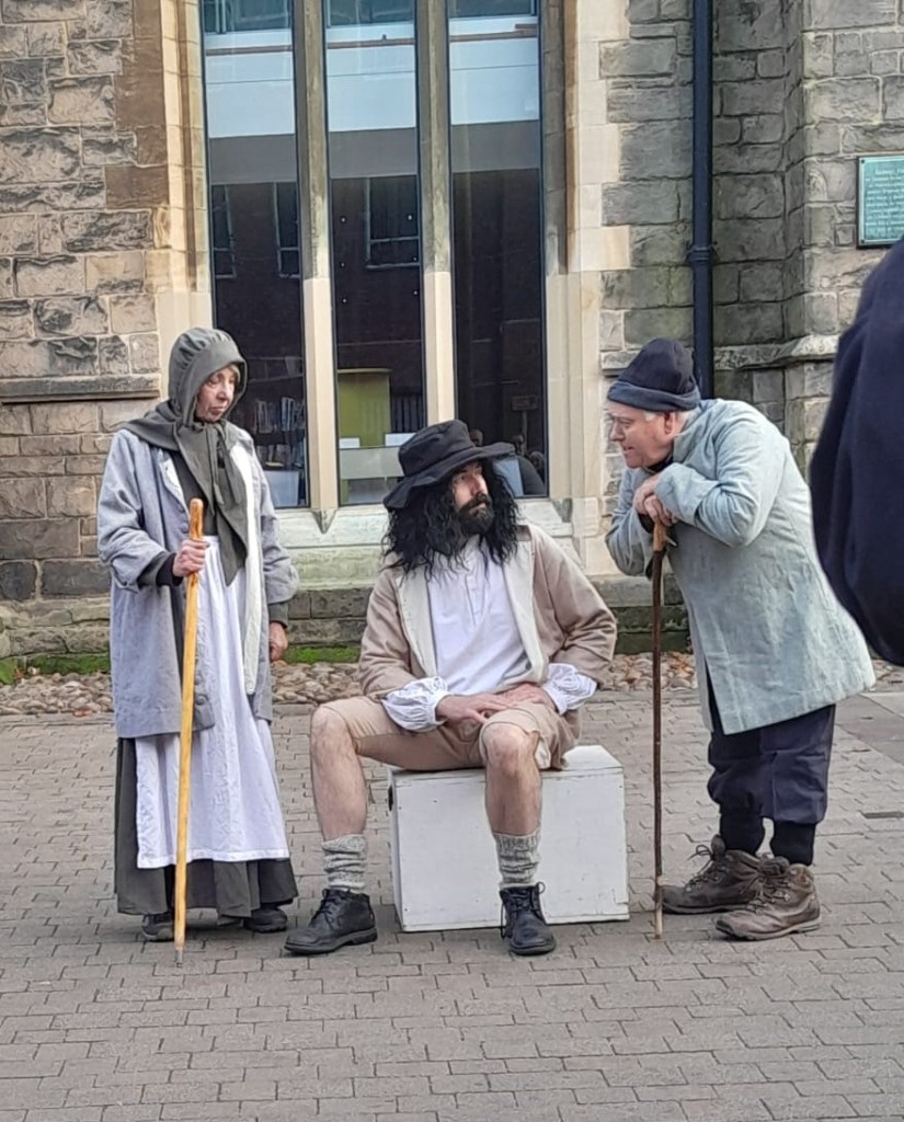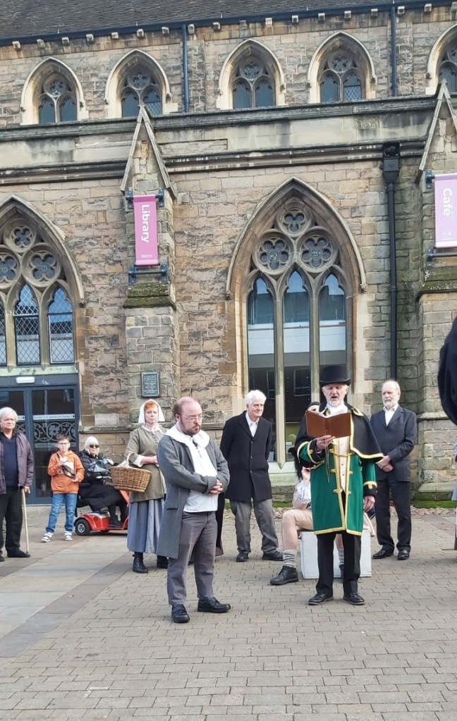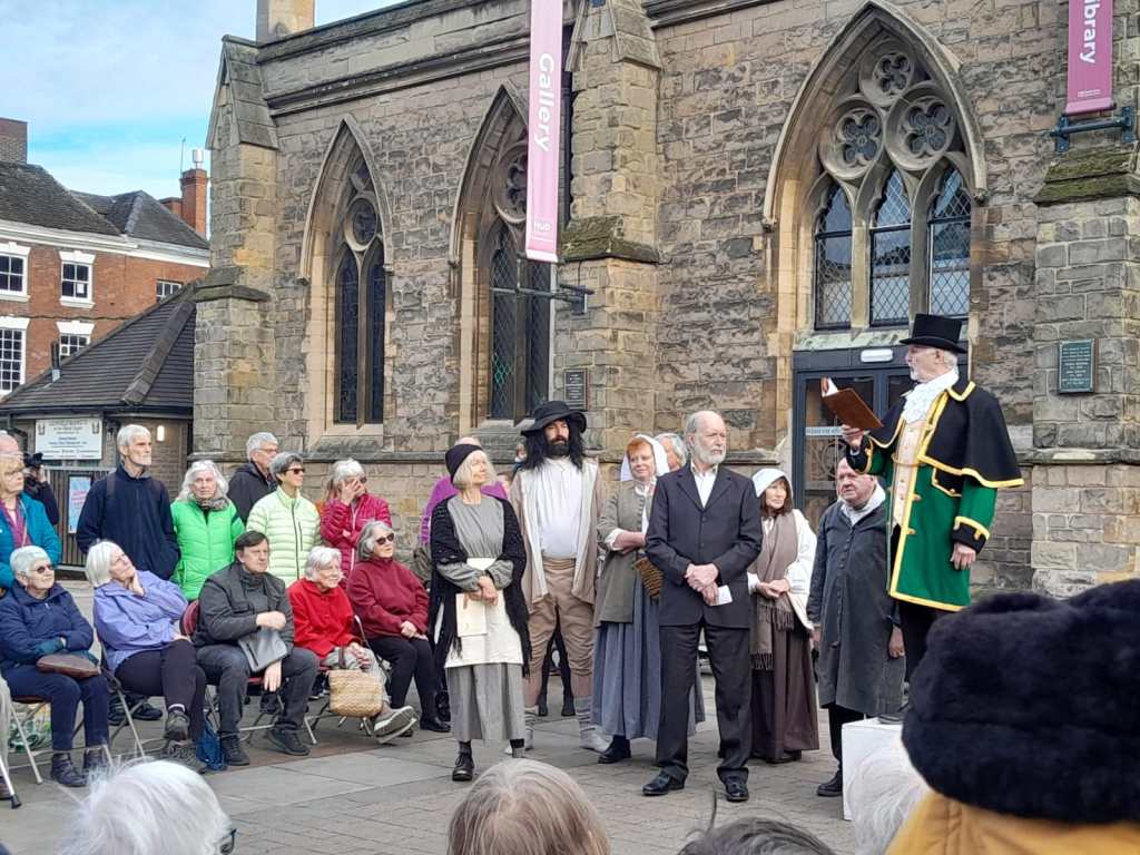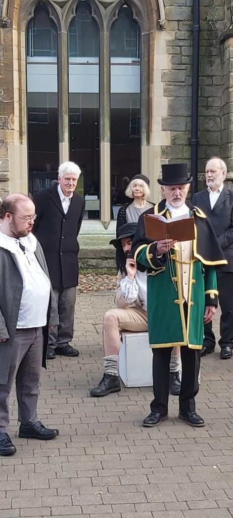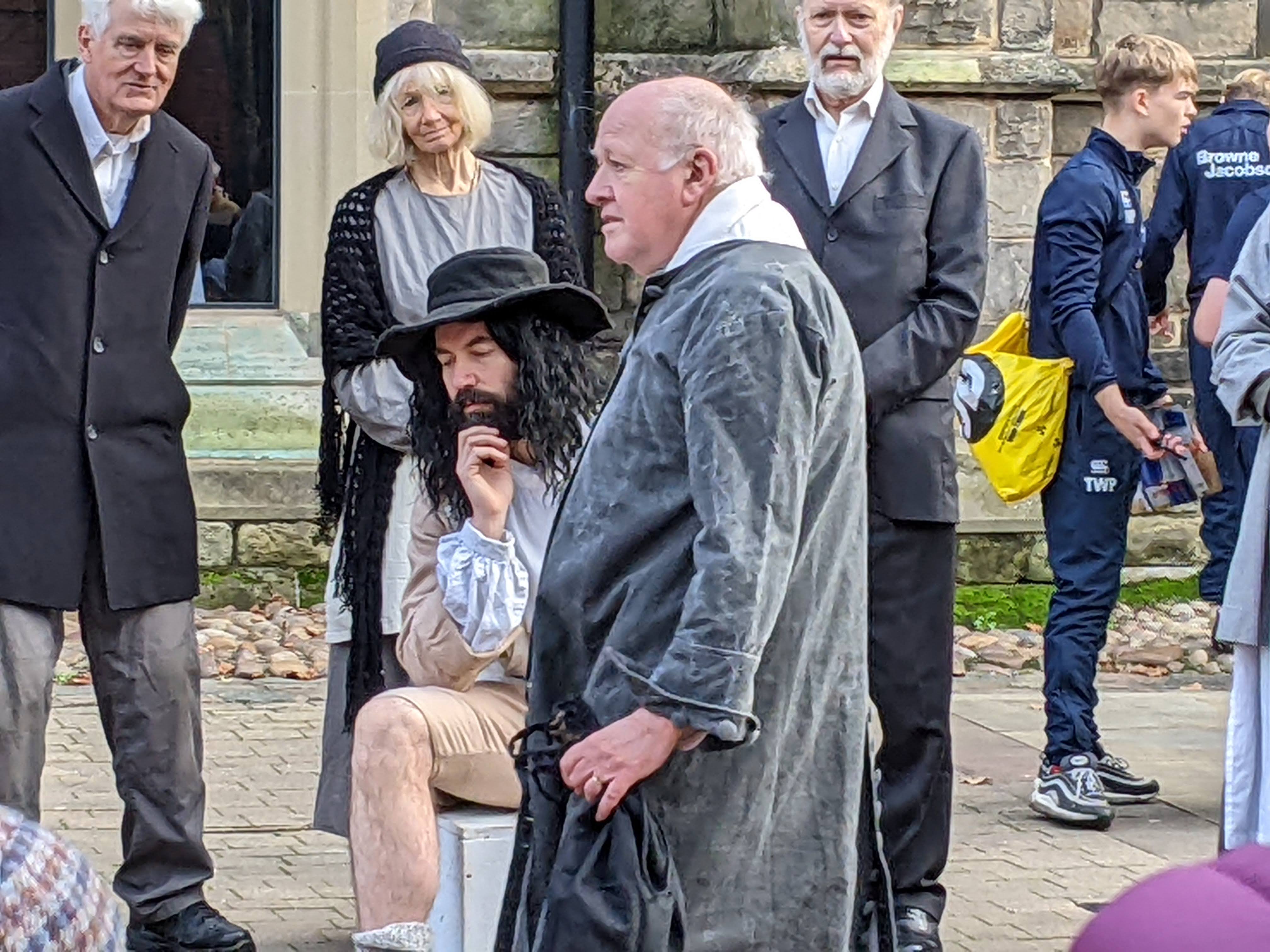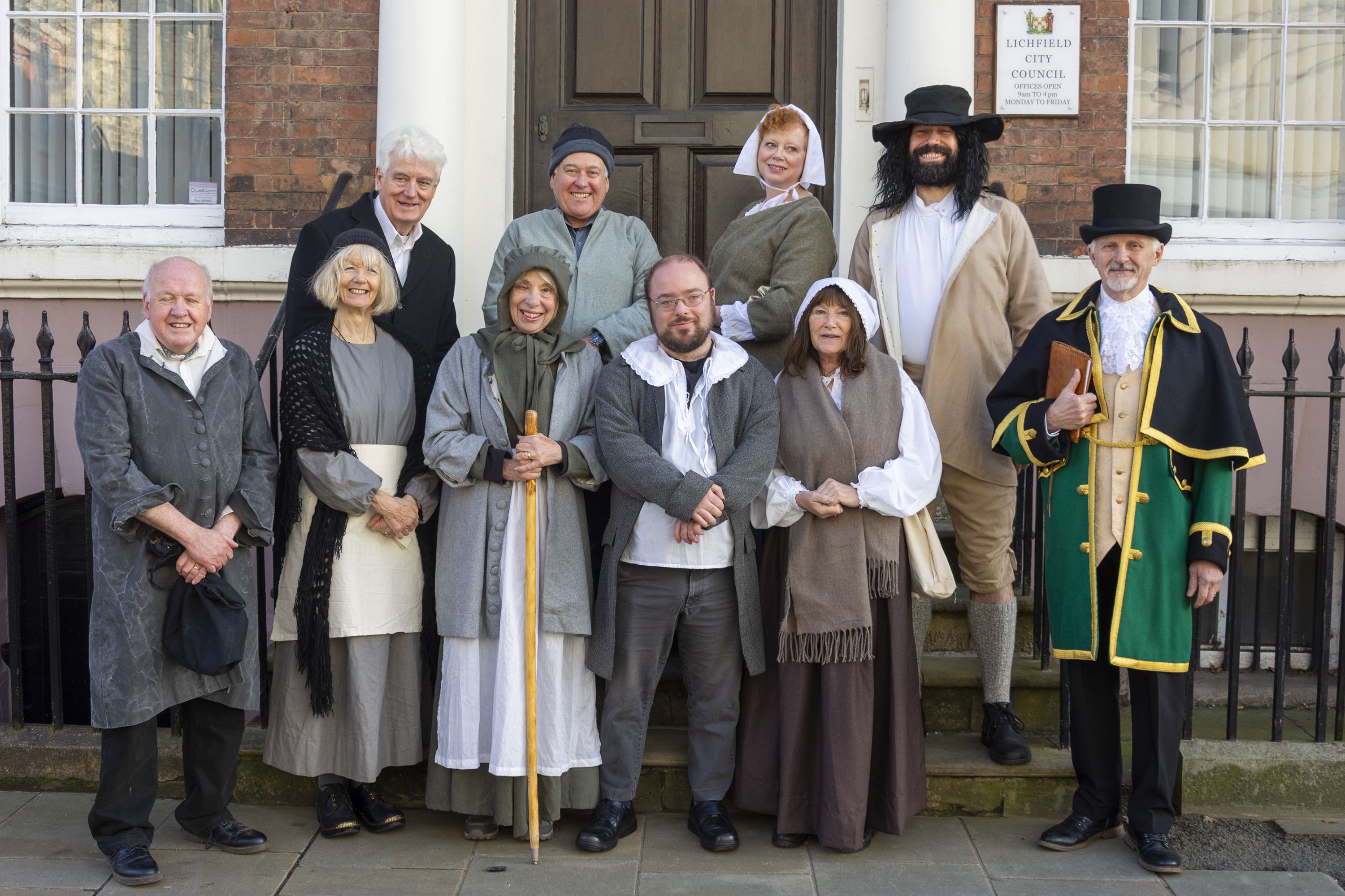 Front row – John Westaby (Gaoler 1), Ayliffe Edwards (Reader 3), Sue Royal (Rebecca, a shepherd), Michael Brown (Gaolor 2), Michele Gerard (Elizabeth, a customer), Adrian Waters (Lichfield Town Crier)