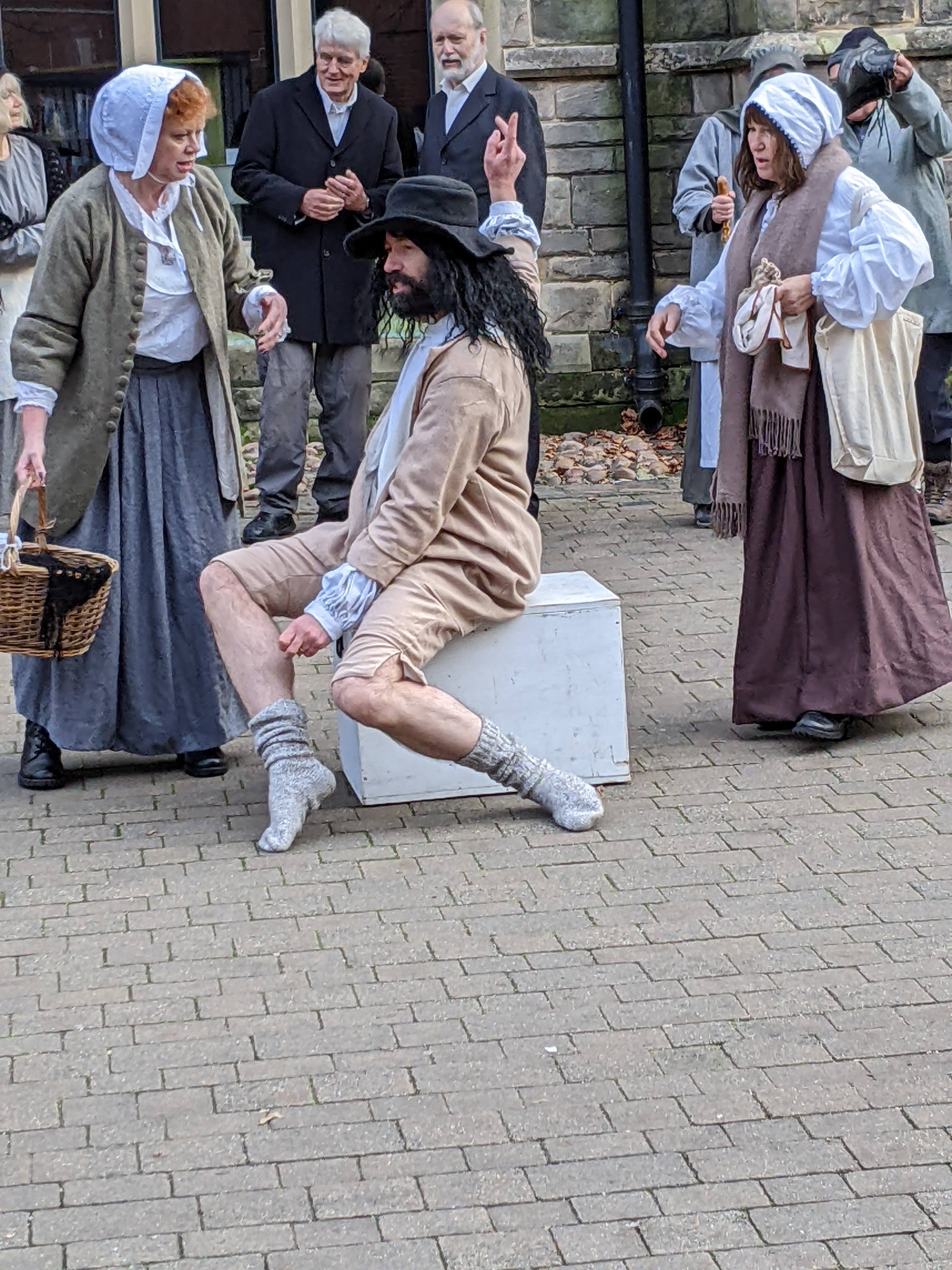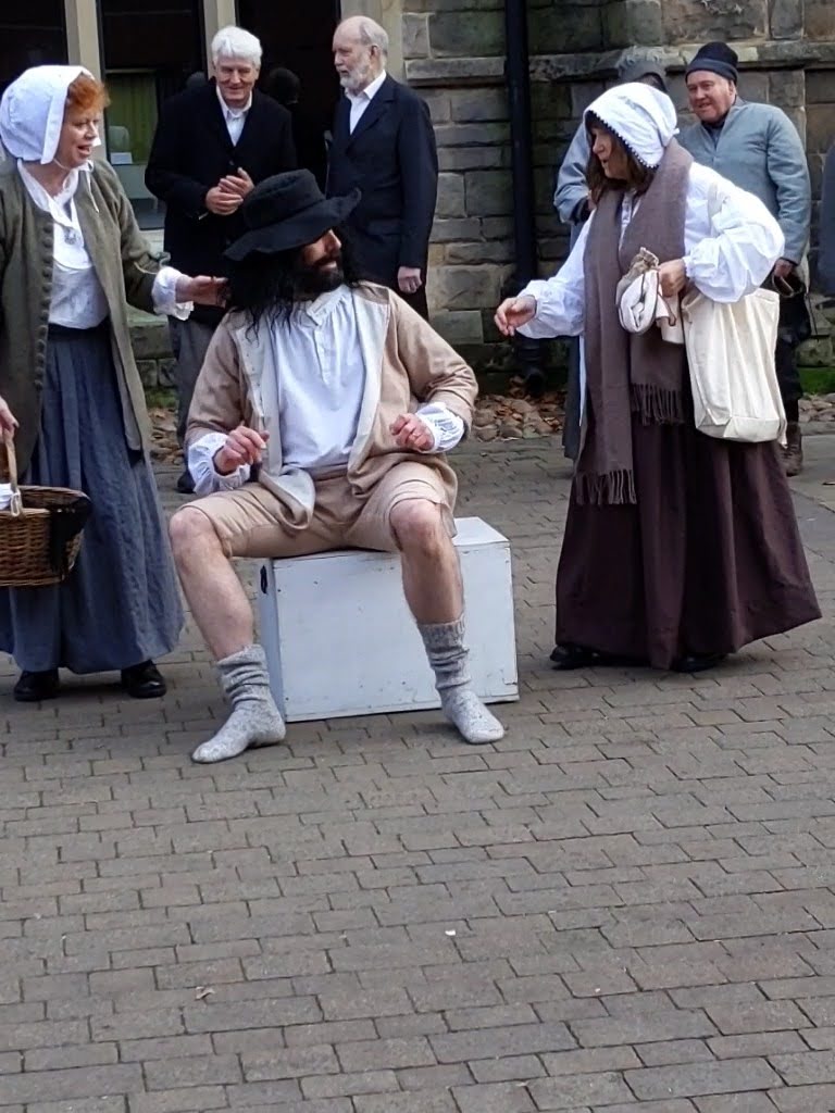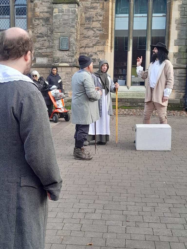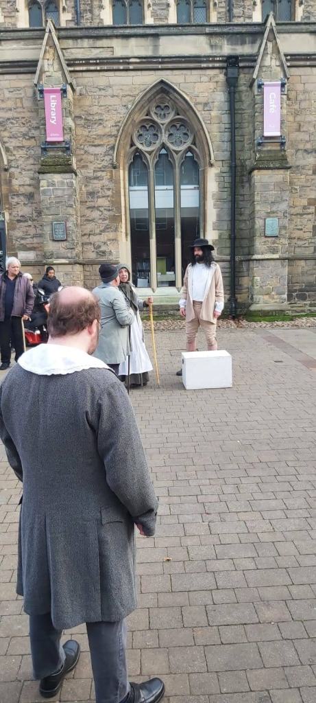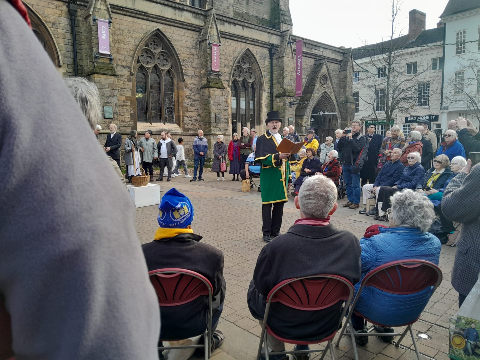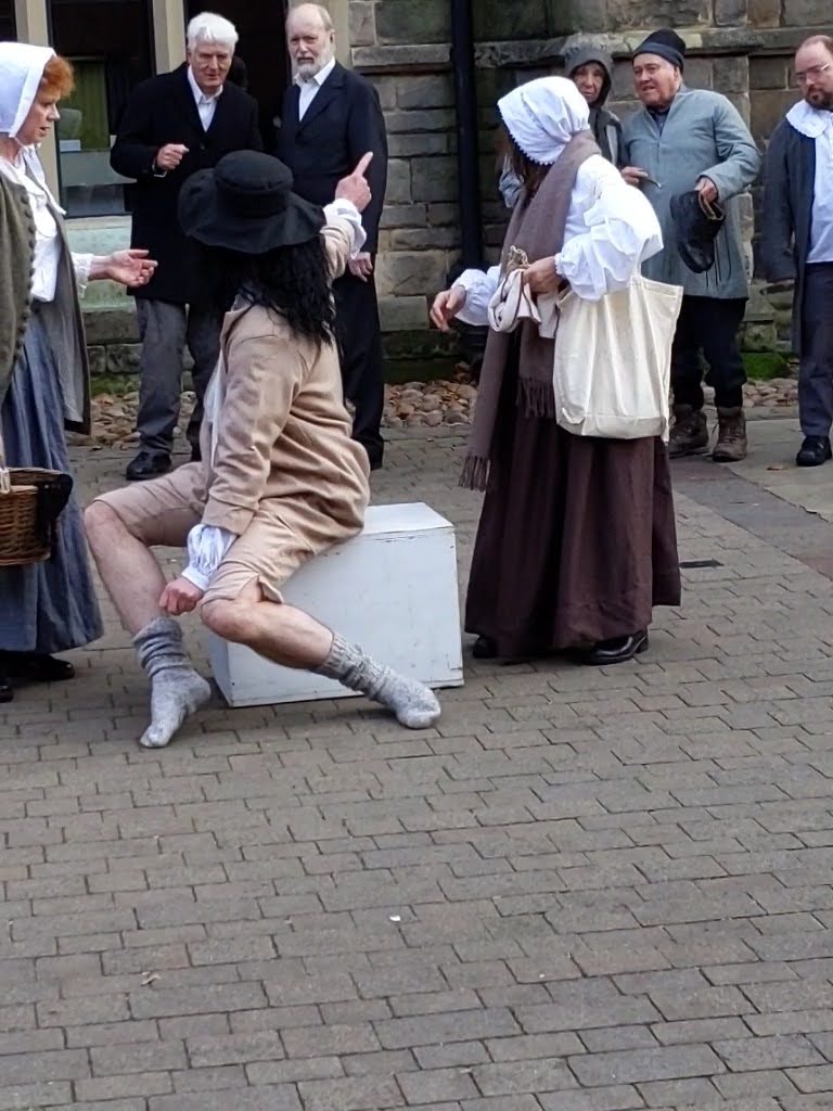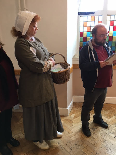 Front row – John Westaby (Gaoler 1), Ayliffe Edwards (Reader 3), Sue Royal (Rebecca, a shepherd), Michael Brown (Gaolor 2), Michele Gerard (Elizabeth, a customer), Adrian Waters (Lichfield Town Crier)