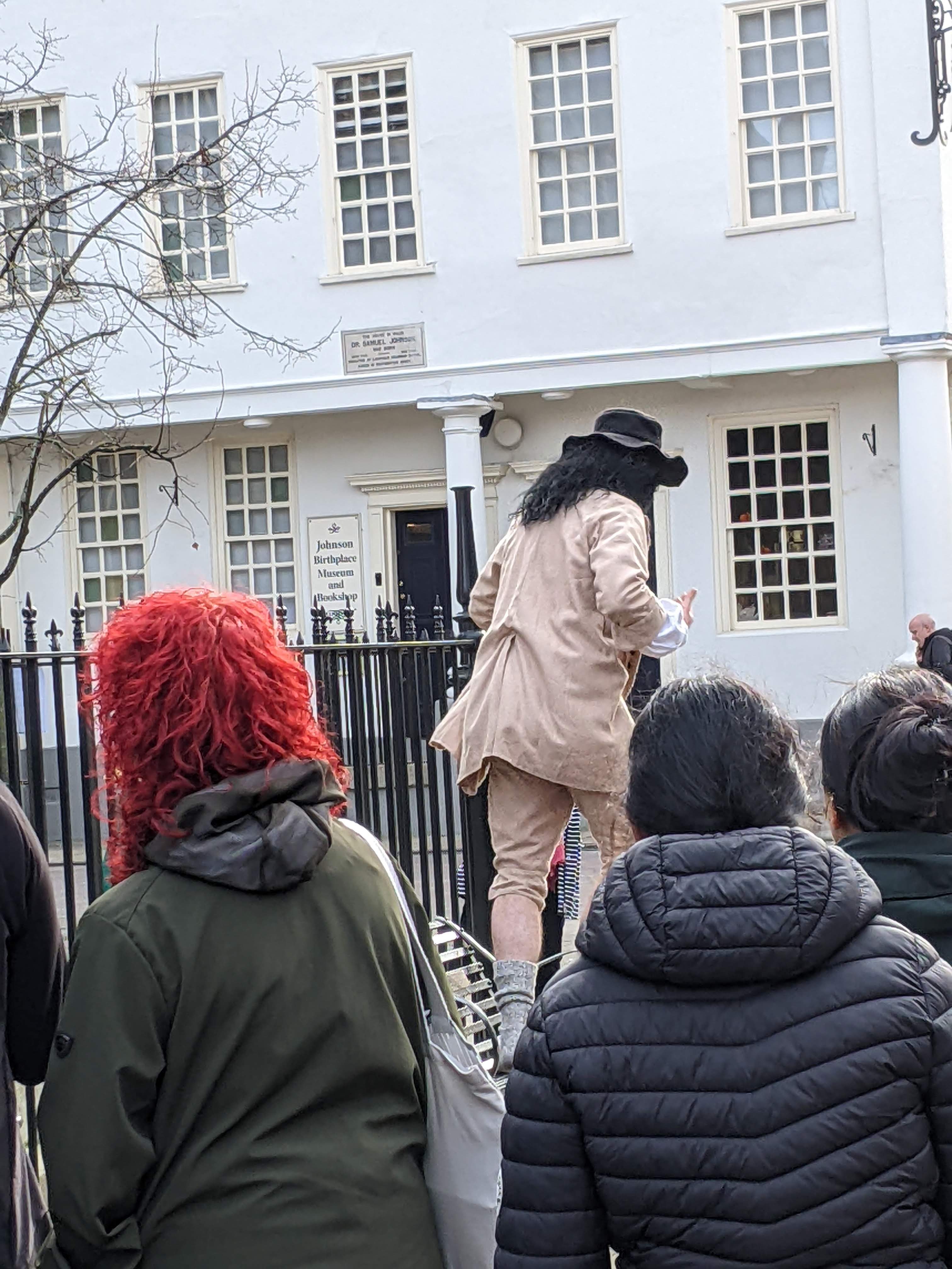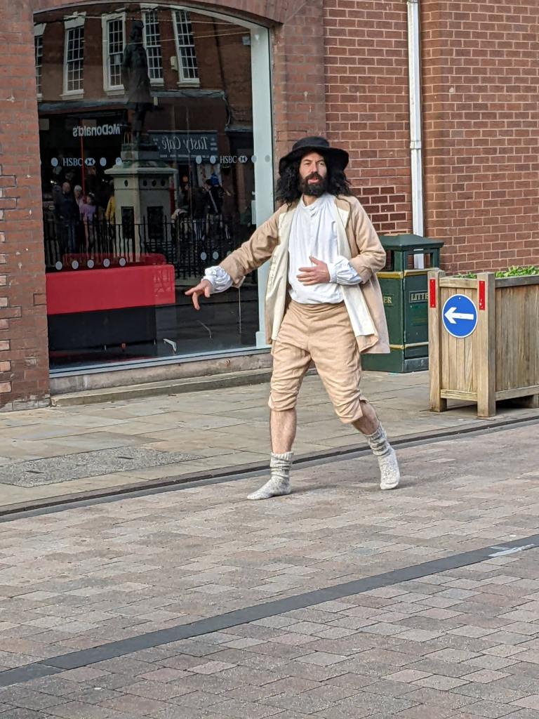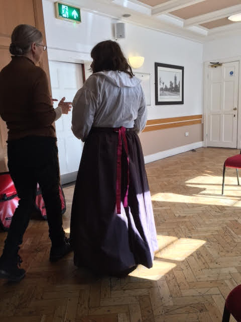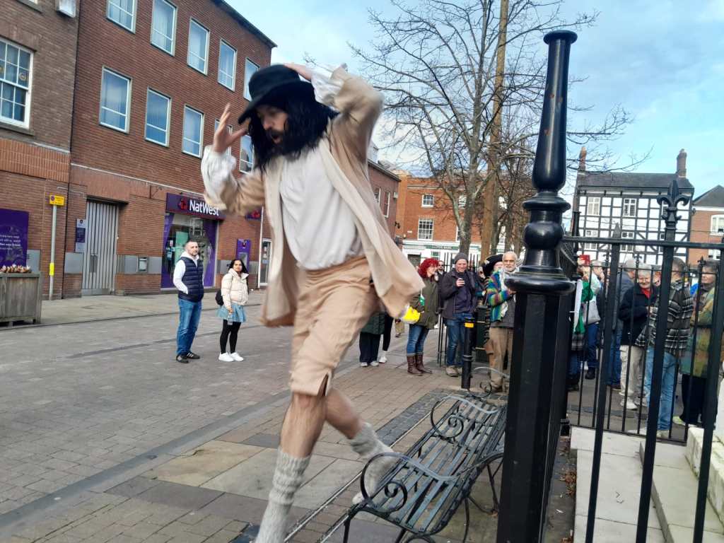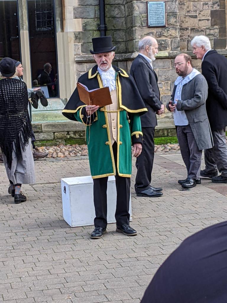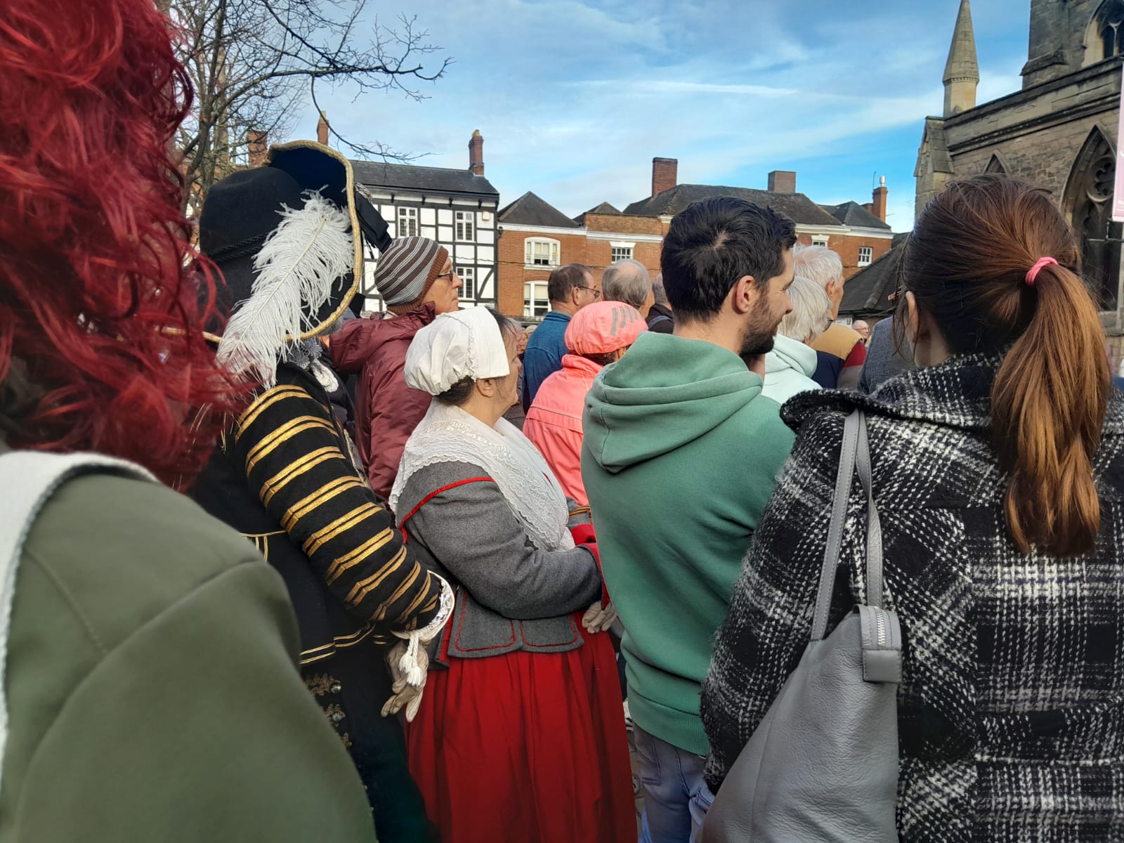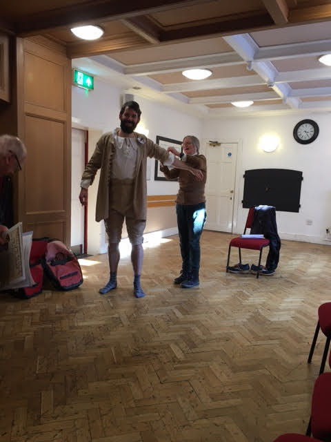 Front row – John Westaby (Gaoler 1), Ayliffe Edwards (Reader 3), Sue Royal (Rebecca, a shepherd), Michael Brown (Gaolor 2), Michele Gerard (Elizabeth, a customer), Adrian Waters (Lichfield Town Crier)