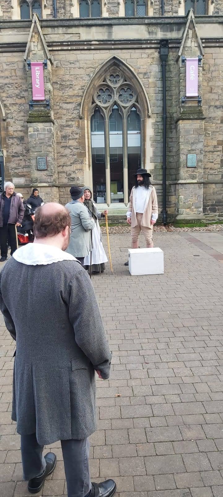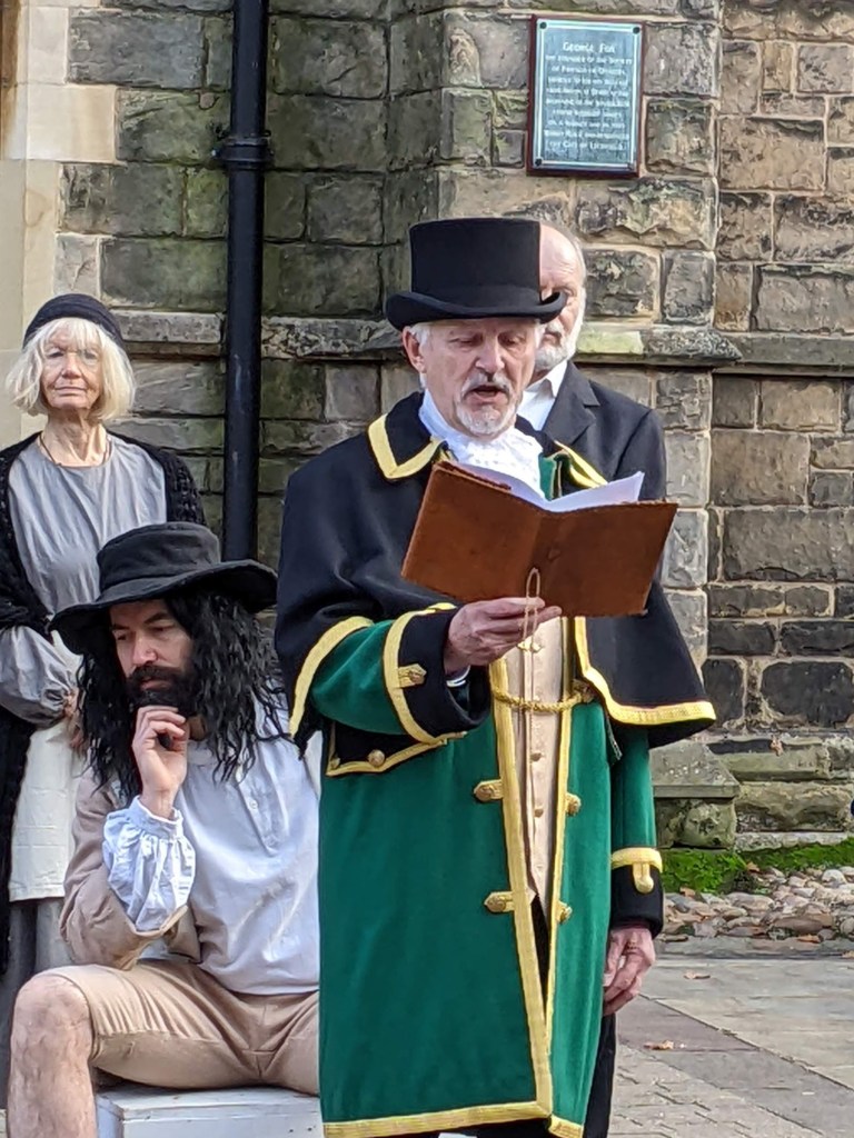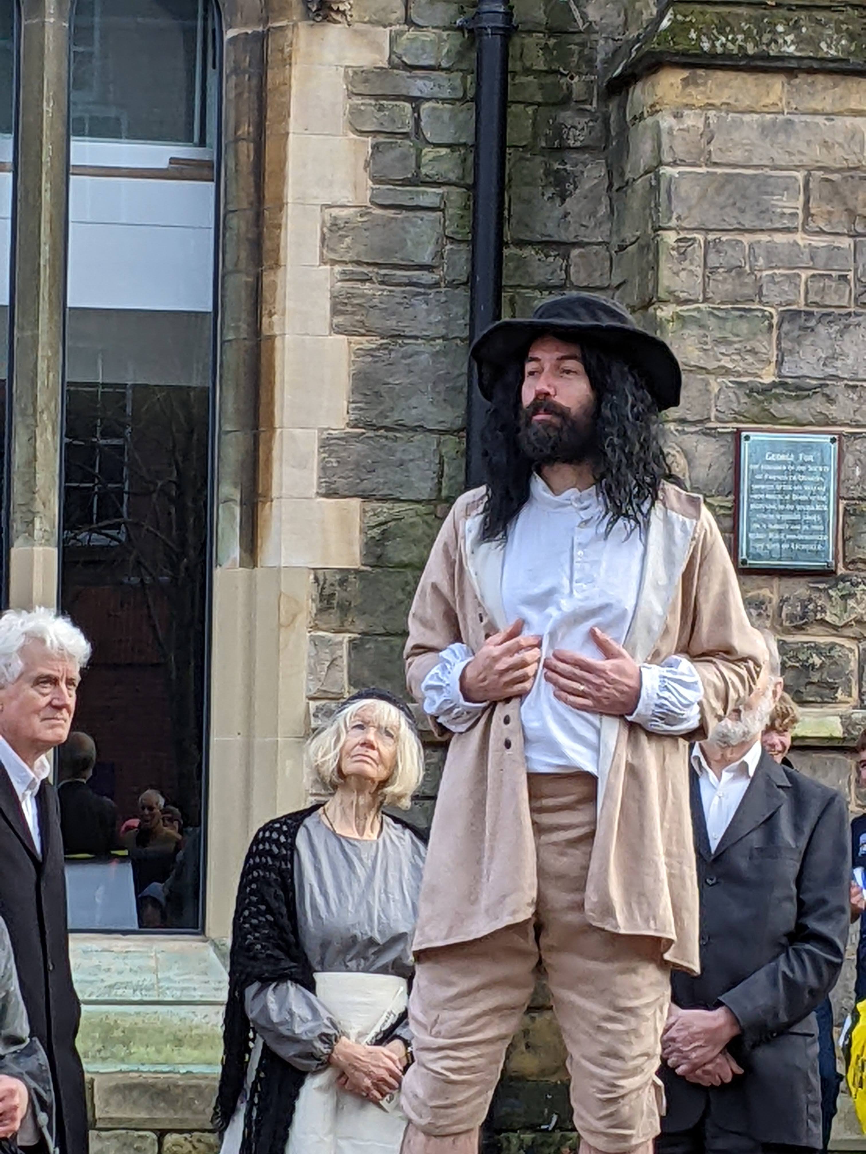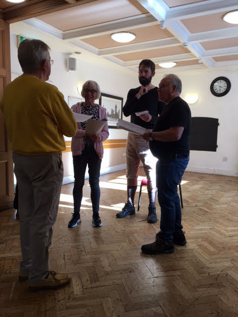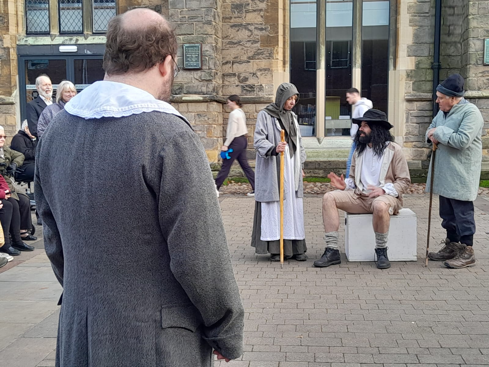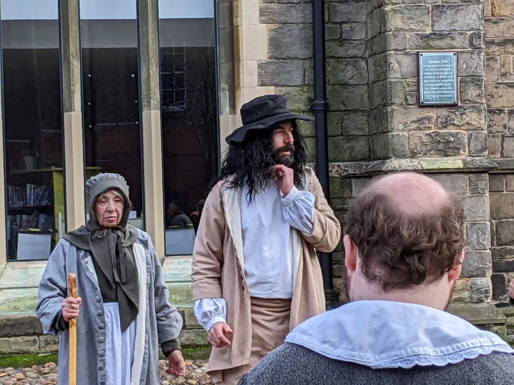 Back row – Nigel Moss (Reader 1), Kevin Royal (John, a shepherd), Fiona Willimott (a pedlar), Barnaby Waters (George Fox)