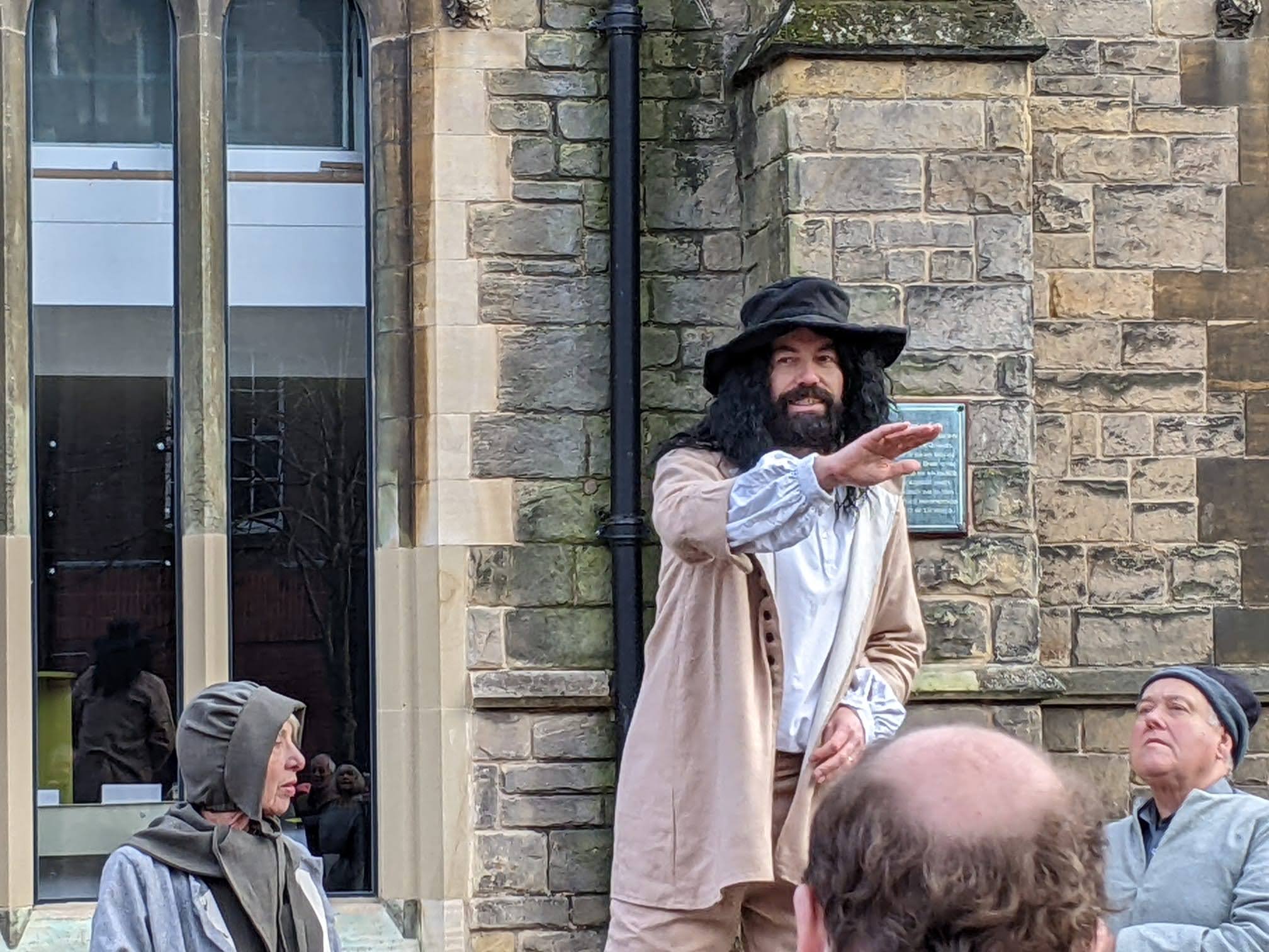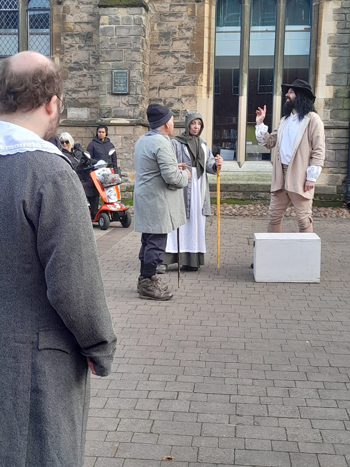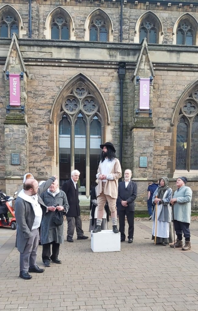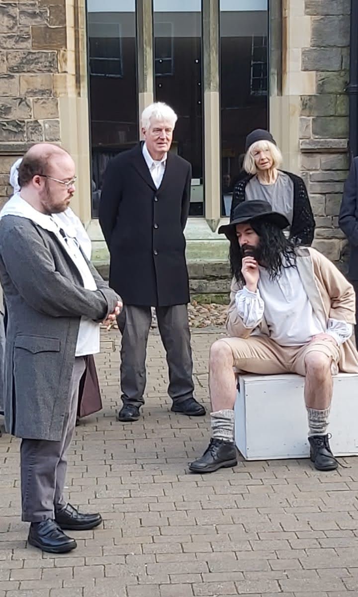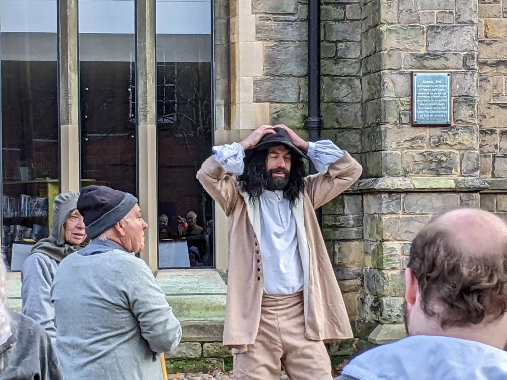 Back row – Nigel Moss (Reader 1), Kevin Royal (John, a shepherd), Fiona Willimott (a pedlar), Barnaby Waters (George Fox)